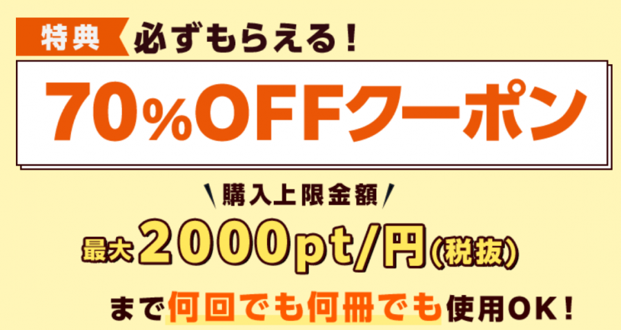 | 概要 | 新規無料会員登録時、好きな作品に使える70%OFFクーポンがもらえます。 |