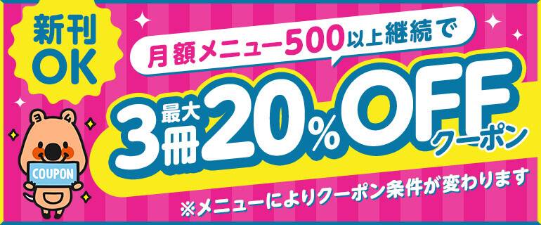 月額メニュー500以上継続で最大3冊20%OFFクーポン