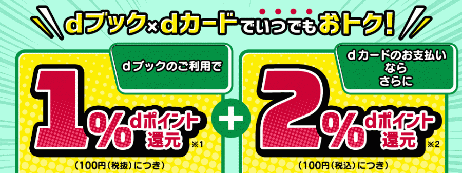 dカードを利用して支払いをすると2%のポイント還元になり、dブック自体のポイント還元もあわせて3%のポイントが付与されます。