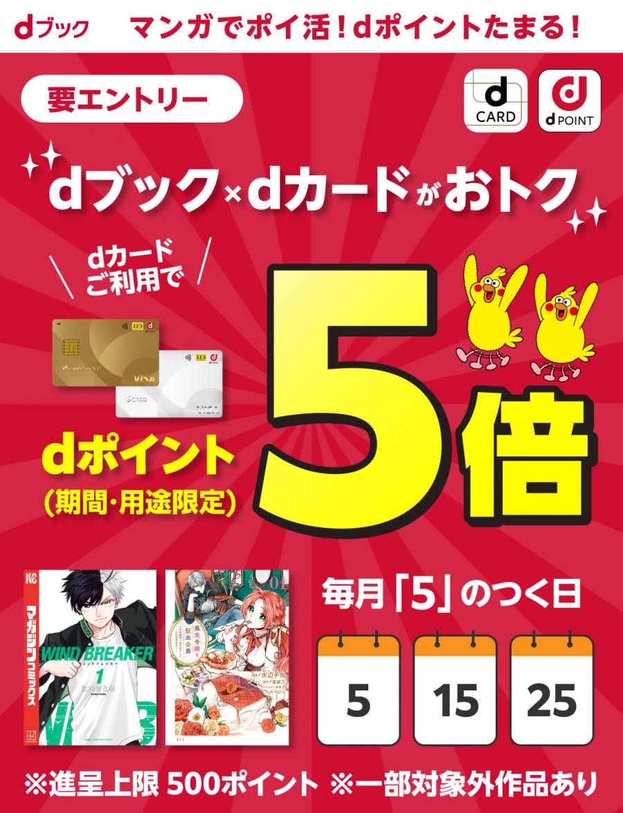 毎月5の付く日にdカード支払いで本を買うと、通常ポイント1倍を含めて最大5倍になるキャンペーンです。例えば500円の書籍購入で25ポイント追加で付与されることになります。