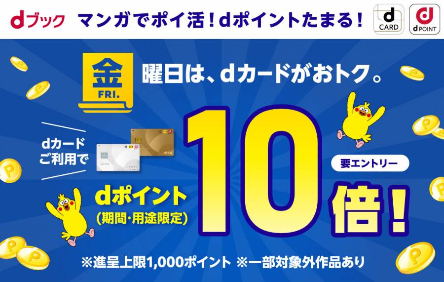 事前エントリーの上で金曜日に書籍をdカードで購入すると、最大10倍のdポイントが還元(※上限1,000ポイント)されます。