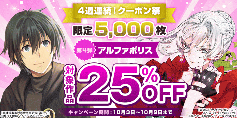 6月1~3日はKADOKAWAの全作品が対象の40%OFFクーポン・4~5日は異世界恋愛マンガ対象の20%OFFクーポンが配布されました。今後は下記のスケジュールでクーポンが配布されます。
